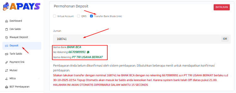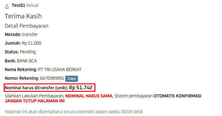 - Sistem akan mengeluarkan Nominal dengan 3 Angka Kode Unik ** Untuk Notifikasi REAL TIME Harap Lakukan pembayaran SESUAI NOMINAL yang di berikan oleh Sistem