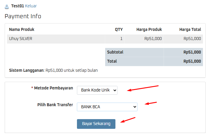 - Silahkan Pilih cara bayar [ Bank Transfer ]